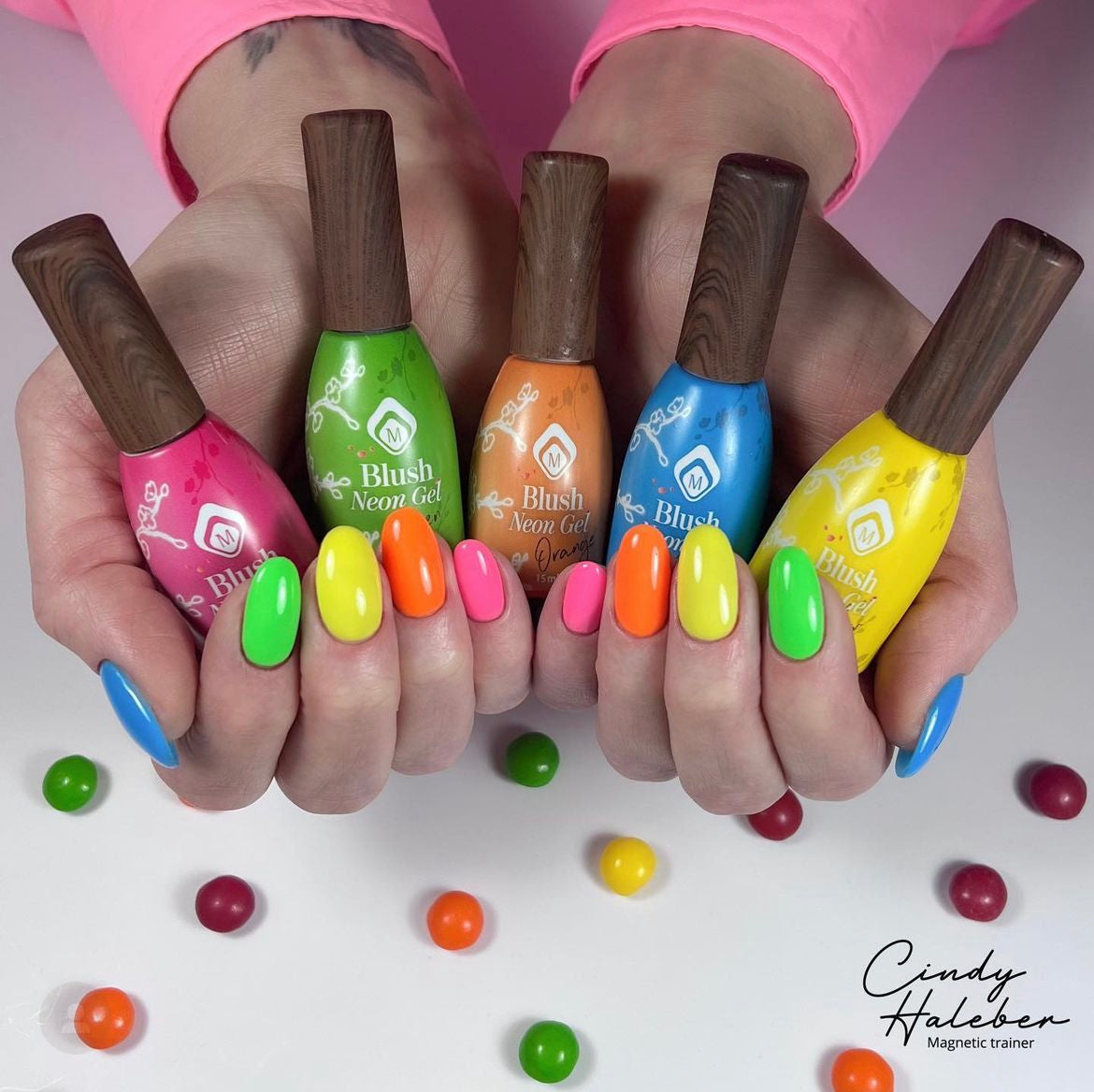 Colored builders in a bottle with which you give your customers a summery look in an instant while the Neon Blushes have enough transparency for a beautiful glitter tree at the Cuticle.