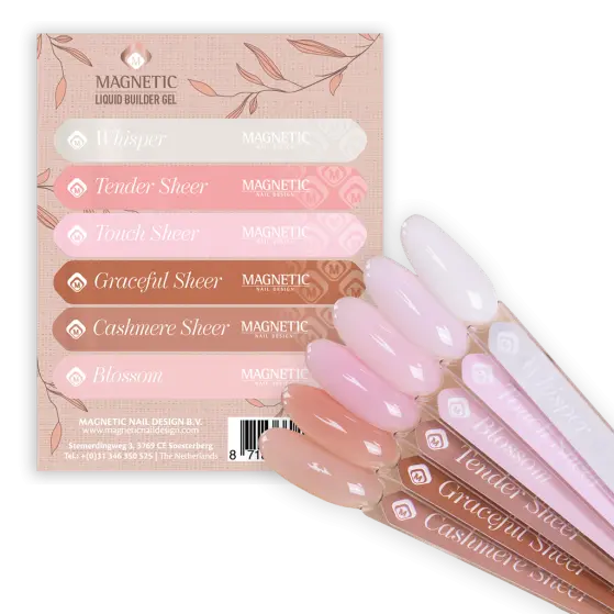 Elevate your salon game with the complete Magnetic Liquid Builder Gel Collection — all six refined tones in one luxury pack: